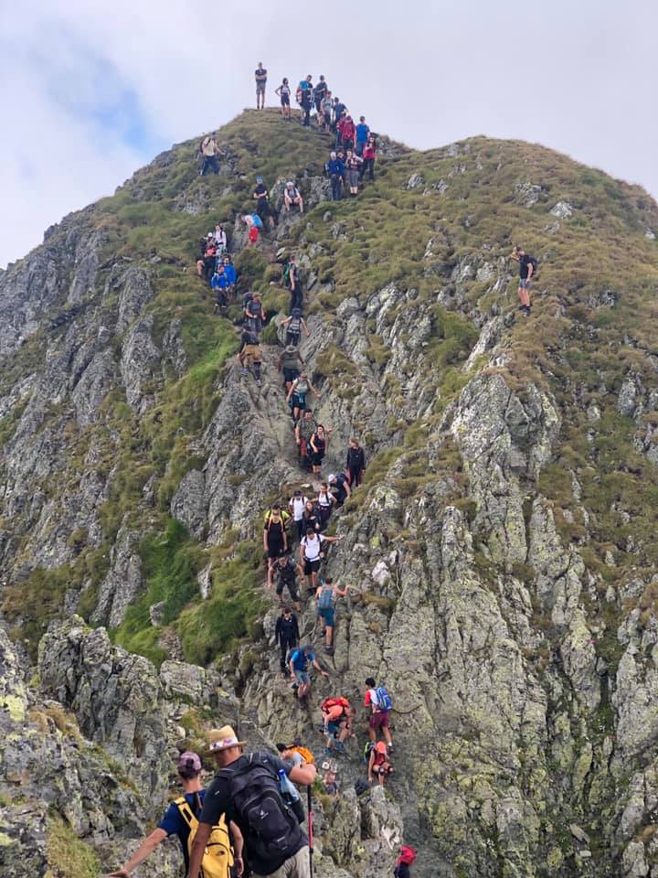 Pe rețelele sociale au apărut poze și filmări cu turiști așteptându-se unii pe alții în drum spre vârf, în zonele unde accesul este mai dificil.