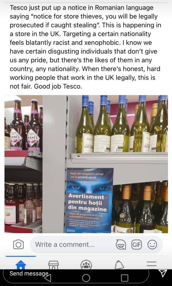 Scandalul provine de la un poster pe care este scris în limba română mesajul: “Avertisment pentru hoții din magazine. Hoții din magazine prinși vor fi urmăriți penal. Ofițerii de poliție îmbrăcați în civil acțonează în această zonă”.
