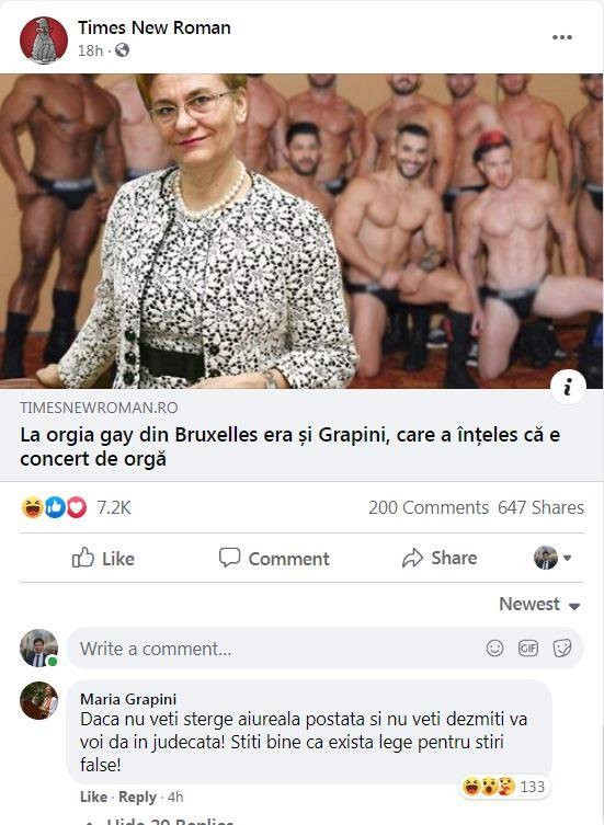 „Dacă nu veți șterge aiureala postată si nu veți dezmiți(sic) vă voi da în judecată! Știți bine că există lege pentru știri false!” a comentat Maria Grapini la postarea publicată pe pagina de Facebook a Times New Roman.