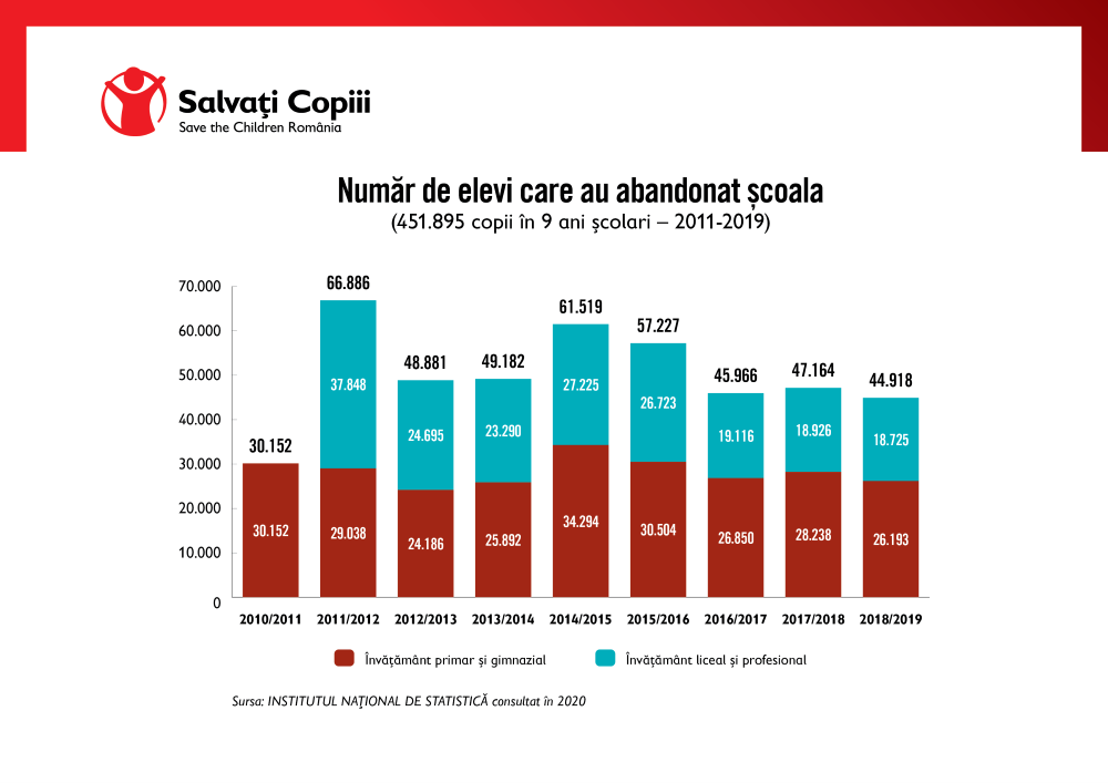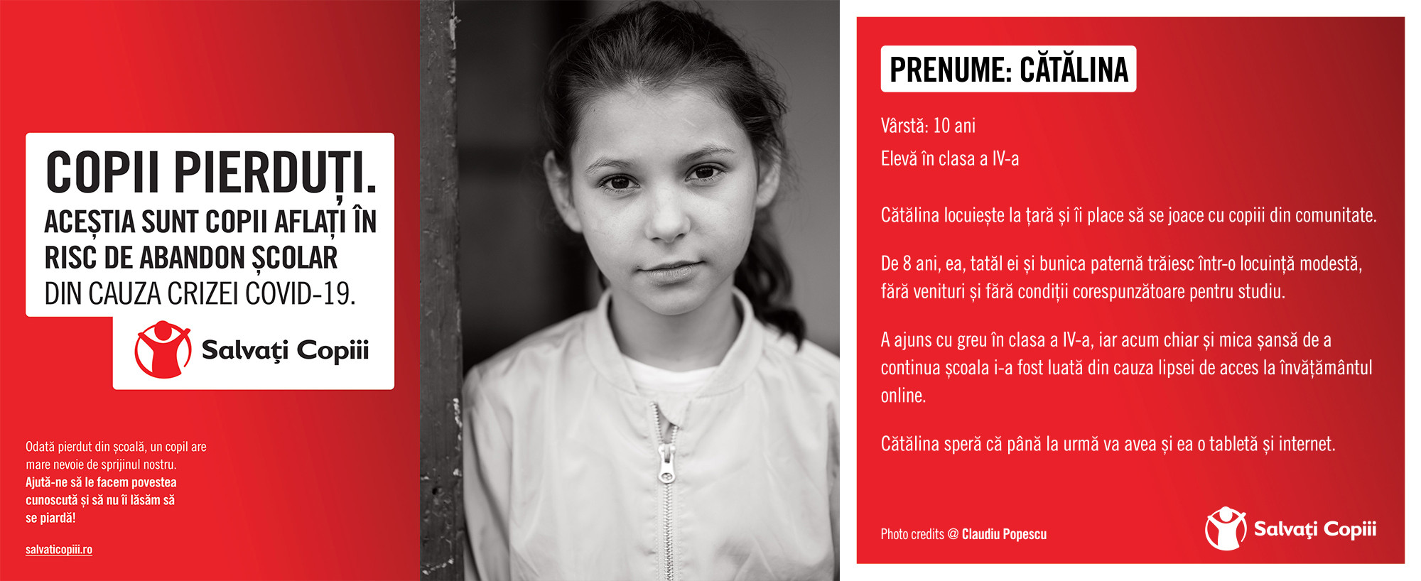 De la adoptarea Legii educației naționale în 2011 și până în prezent, România a pierdut 451.895 de copii. Sunt copii care au abandonat școala, cu povești de viață similare experiențelor celor 30 de copii incluși în campania „Ajută-ne să nu-i lăsăm să devină #CopiiPierduti”: Elena, Andrei, Cătălina, Albert, Toni, Ramona, Marian, Luca, Ionuț, Mihai, Vlăduț, Gabriela, David, Daniel, George, Alina, Bianca, Andrei, Ioana, Edi Anișoara și alţii. La finalul acestui an marcat de o criză sanitară globală care a schimbat profund vieți, priorități și comportamente, Salvați Copiii atrage atenția asupra faptului că traversăm o perioadă critică pentru educația copiilor noștri.