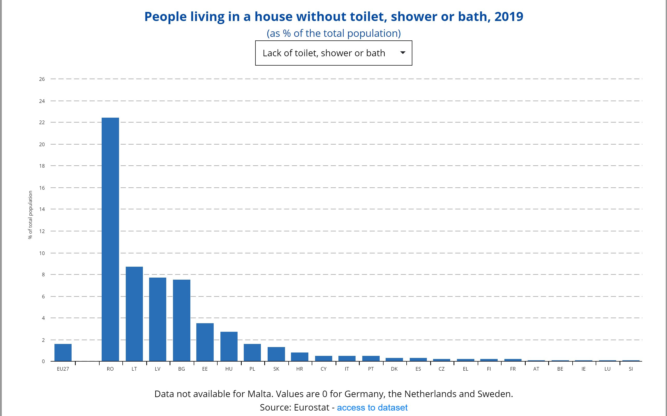 Media la nivelul celor 27 de state membre UE este de 1,6%, iar în țările din vecinătatea României, cum ar fi Bulgaria, statul cu care împărțim de cele mai multe ori ultimele locuri în clasamentele Uniunii Europene, situația arată mult mai bine, procentul fiind de 7,5%. În ceea ce privește Ungaria, procentul populației care nu deține o toaletă în interiorul locuinței este de 2,7%.