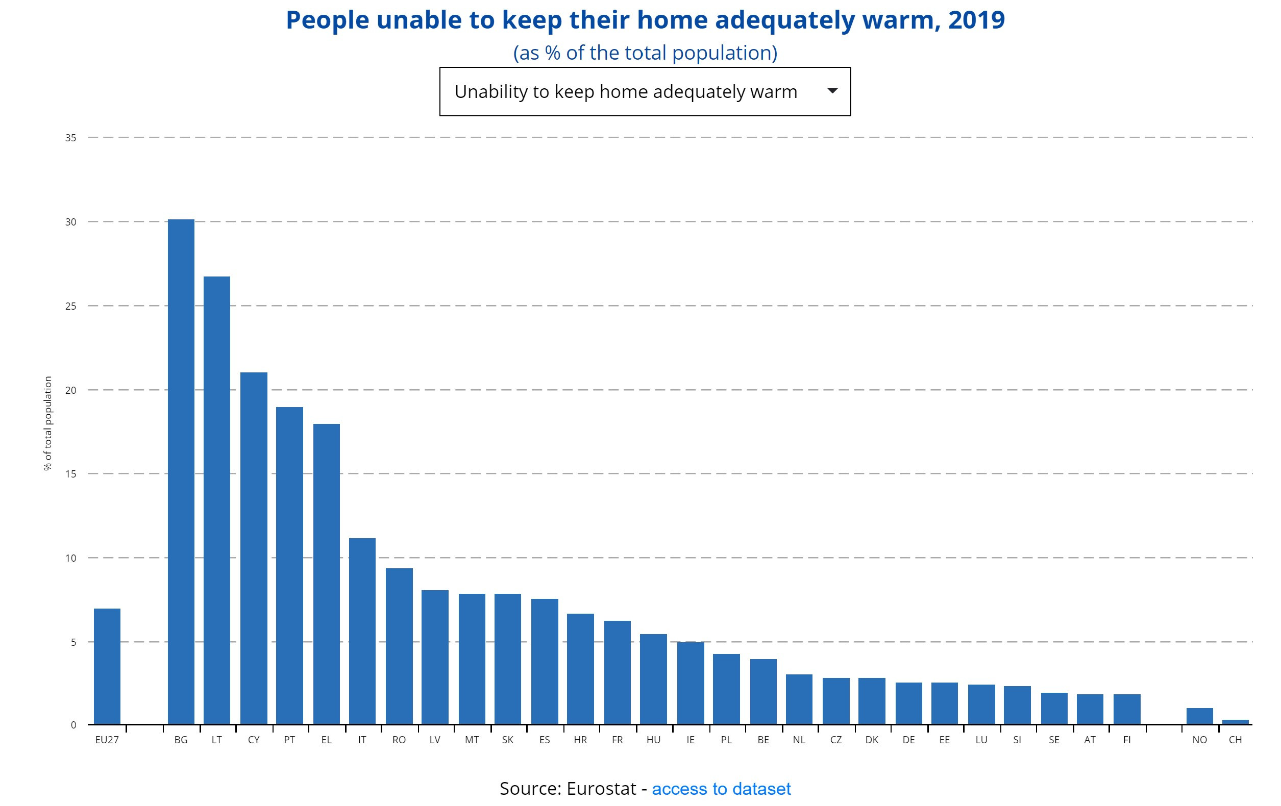 Tot în cadrul aceluiași raport, Eurostat vorbește și despre procentul populației din Uniunea Europeană care nu reușește să își asigure încălzirea locuinței. Aici, țara noastră stă ceva mai bine, datele publicate arătând faptul că doar 9,3% dintre români nu își permit financiar să își încălzească casa în mod corespunzător, în timp ce la vecinii bulgari procentul este de 30%. Media la nivelul Uniunii Europene este de 6,9%
