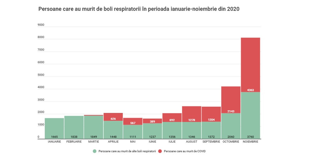 Situația statistică publicată de INS, în special datele referitoare la decesele cauzate de „boli ale aparatului respirator”, confirmă din nou impactul pe care l-a avut COVID-19 asupra României. Din ianuarie până în noiembrie 2020, au murit cu cel puțin 13.000 mai multe persoane din cauza bolilor aparatului respirator. Dintre acestea, 11.331 au murit din cauza COVID-19, în timp ce 19.000 din cauza altor boli ale aparatului respirator. În total, peste 30.000 de decese.