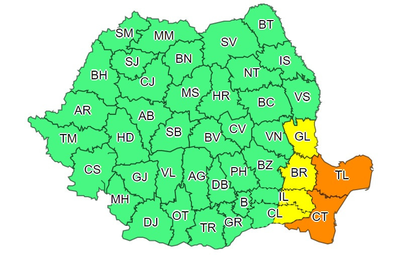În acelaşi timp, în intervalul 27 ianuarie, ora 10:00 - 28 ianuarie, ora 10:00, va fi în vigoare o atenţionare Cod galben de ninsori viscolite în patru judeţe din Dobrogea, estul Munteniei şi sud-estul Moldovei. În zone din judeţele Brăila, Călăraşi, Galaţi şi Ialomiţa va continua să ningă moderat cantitativ şi se va depune strat nou de zăpadă neuniform şi consistent, iar vântul va avea rafale în general de 55 - 65 km/h, viscolind ninsoarea şi determinând scăderea semnificativă a vizibilităţii.