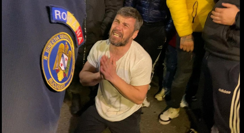 Un protestatar a îngenuncheat în fața unui jandarm și i-a spus că nu mai suportă faptul că locuiește cu chirie și că fiica lui a trebuit să plece din țară din cauza sărăciei