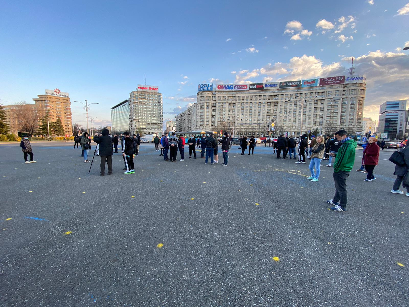 La Victoriei, la început erau mult mai puțini oameni, câteva zeci, în timp ce la Universitate erau adunați în jur de 150. La început, în jurul orei 18:30, au fost bătrânii și adulții, majoritatea fără mască, care stăteau și suflau în vuvuzele sau fluierau. Erau prezenți și câțiva lăutari care spuneau că au ieșit pentru că vor să fie deschise restaurantele ca să poată munci.