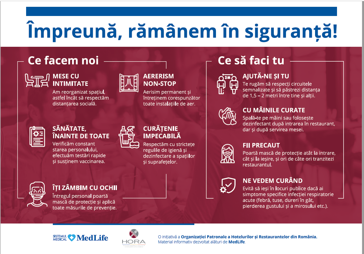 Organizaţia Patronală a Hotelurilor şi Restaurantelor din România - HORA anunță lansarea campaniei „Dor de bun și bine”, cu misiunea de a facilita crearea unui cadru de funcționare în siguranță a business-urilor din HoReCa, sector grav afectat de pandemie. Inițiativa are în prim-plan „Ghidul de siguranță în restaurante”, primul material din România care definește măsurile optime de siguranță și responsabilitate destinate atât operatorilor din industrie, cât și consumatorilor, și formulate în linie cu obiectivul național de a preveni apariția unor situații favorabile răspândirii virusului. Ghidul este dezvoltat alături de specialiștii în servicii medicale din cadrul MedLife.