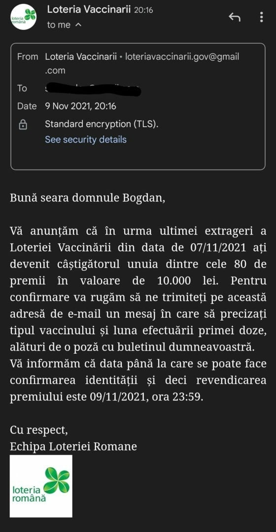 Atenție mare la mail-urile venite în numele Loteria Română, în care sunteți anunțați că ați câștigat la Loteria Vaccinării. De fapt, mesajul respectiv este un #scam special creat de atacatori, care cer ca validare a identității 'câștigătorului' date despre perioada de efectuare a vaccinului, dar și o copie după buletin.