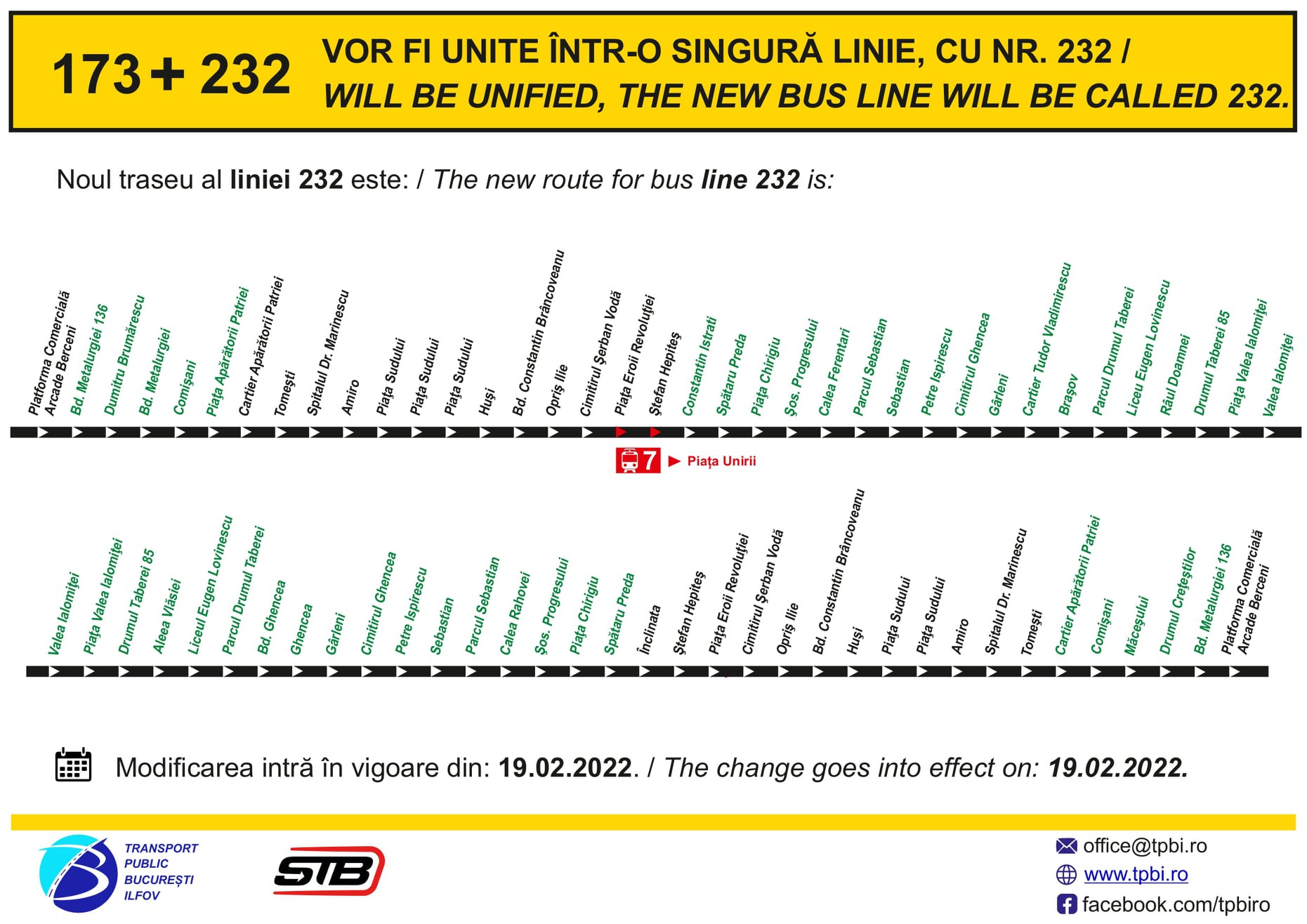 Liniile de autobuz 173 si 232 vor fi comasate începând de sâmbătă, 19 februarie 2022, cetățenii din cartierele Drumul Taberei și Berceni având astfel asigurată o linie directă de transport, anunță Asociația de Dezvoltare Intercomunitară pentru Transport Public București – Ilfov (TPBI).