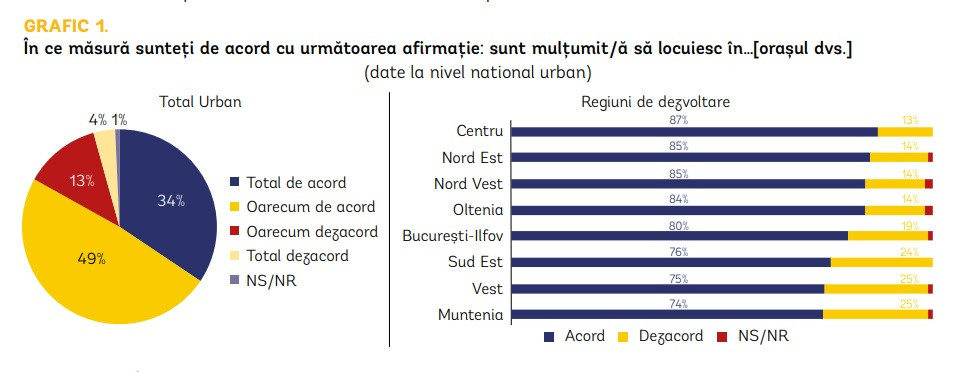 Astfel, din primul aspect vizat de autorii studiului, satisfacția față de viața urbană, reiese faptul că peste 80% din populația din mediul urban este mulțumită de orașul în care trăiește.