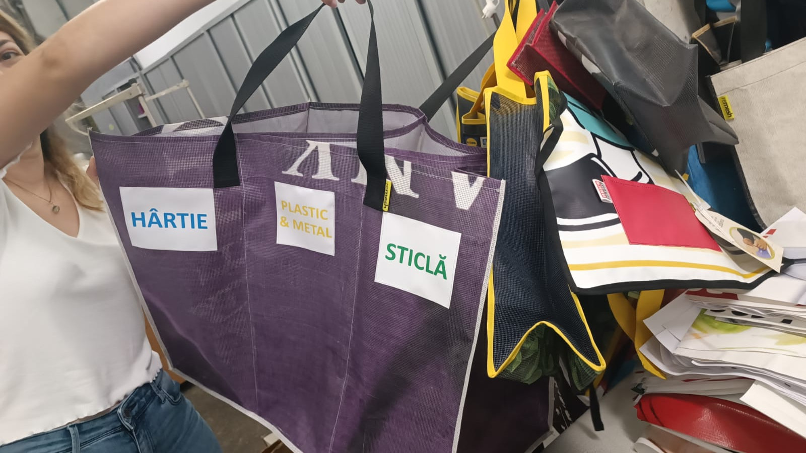 Am fost curioasă să văd cum arată și atelierul Remesh, unde câteva doamne lucrau de zor la mașinile de cusut la care se recondiționează bannere și mesh-uri publicitare, ce sunt transformate ulterior în borsete, plăsuțe, genți pentru reciclare, „îmbrăcăminte” pentru ghivecele de flori.