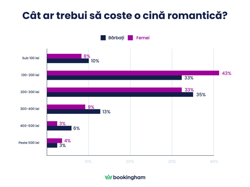 Cât privește bugetul, cele mai multe femei (43%) consideră acceptabilă suma de 100-200 lei pentru o cină romantică. Bărbații (35%) văd mai potrivită suma de 200-300 lei.
