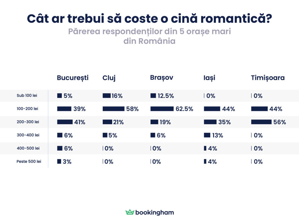 Suma de 100-200 lei pentru o cină romantică e considerată normală și de cei mai mulți români din alte orașe ale țării: Brașov, Constanța, Iași, Oradea, Sibiu, Târgu Mureș. Timișorenii sunt mai generoși. La fel ca bucureștenii, cei mai mulți (56%) consideră că e acceptabilă suma de 200-300 lei pentru o cină romantică.