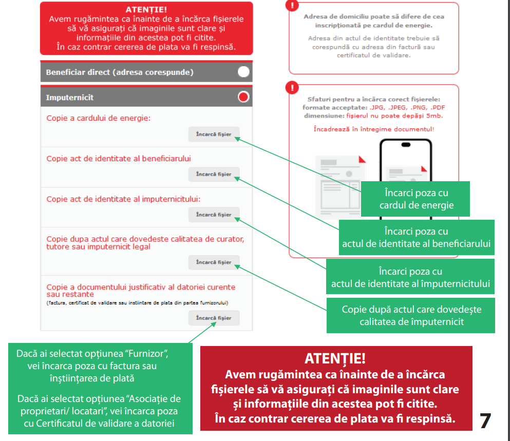 Dacă beneficiarul are un alt domiciliu decât cel trecut pe cardul de energie, el va trebui să urce în aplicație și contractul de furnizare a energiei la domiciliul declarat, plus o declarație pe proprie răspundere a beneficiarului prin care acesta afirmă că utilizează cardul de energie pentru domiciliul la care locuiește. De asemenea, pentru împuterniciți, curatori sau tutori trebuie urcate și fișiere cu actele care demonstrează această calitate