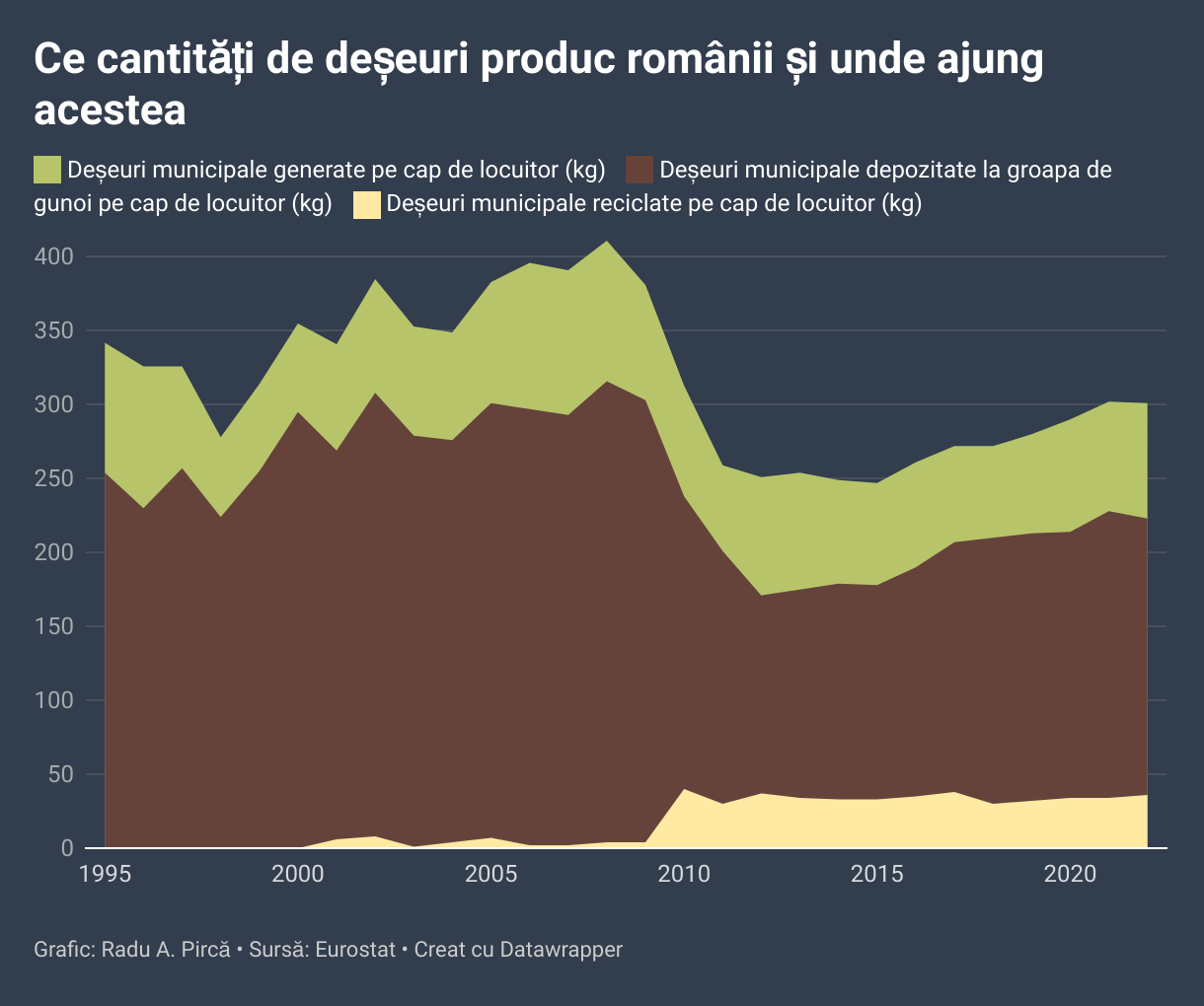 O a doua explicație ține de ce se întâmplă cu aceste deșeuri. În medie, în UE cam 50% dintre ele sunt reciclate. Austriecii reciclează anual peste 500 de kilograme pe cap de locuitor și mai puțin de 20 kilograme ajung la groapa de gunoi; danezii reciclează peste 400, iar la groapă ajung în jur de 8 kg. La noi lucrurile stau practic invers: se reciclează 36 de kilograme pe an pe cap de locuitor, iar la groapa de gunoi ajung 223 de kilograme pe cap de locuitor – în total, peste 4 milioane de tone anual. Și asta cu toate că până în 2035 ar trebui să ajungem la doar 10% din deșeuri ”depozitate”.