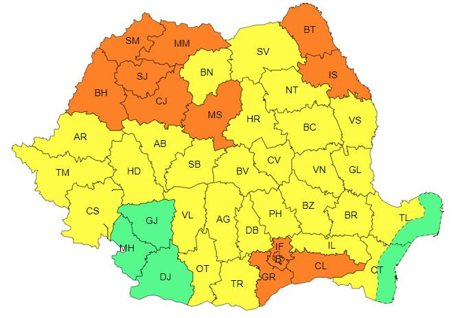 În acelaşi timp, un Cod portocaliu de caniculă şi disconfort termic accentuat va afecta jumătatea de nord a Crişanei, Maramureş, nord-vestul şi centrul Transilvaniei, nord-estul Moldovei şi în sudul şi centrul Munteniei. În general, valorile termice vor oscila între 35 şi 37 de grade.