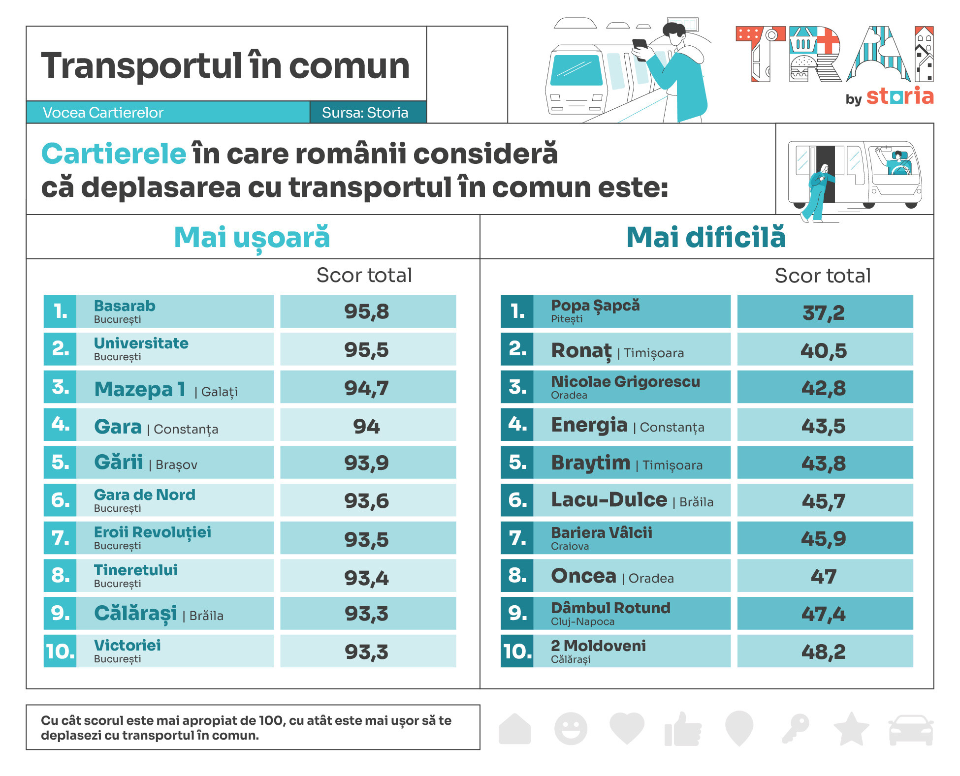 Pe de altă parte, locuitorii din cartierul Popa Șapcă din Pitești consideră transportul public din zonă ca fiind cel mai greu accesibil, obținând un scor de doar 37,2 puncte. Ronaț din Timișoara, cu 40,5 și Nicolae Grigorescu din Oradea, cu 42,8, sunt alte cartiere unde locuitorii percep transportul public ca fiind greu accesibil. Cartierul Energia din Constanța (43,5) și Braytim din Timișoara (43,8) sunt percepute la fel.