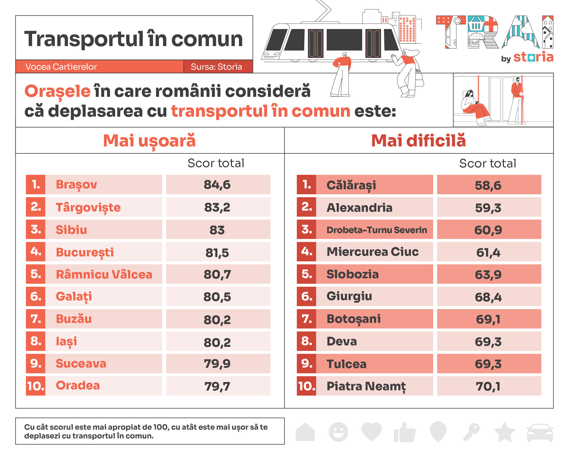 Conform indexului T.R.A.I., realizat de Storia, platforma de imobiliare a grupului OLX, principalele orașe din România în care locuitorii consideră că transportul în comun este accesibil sunt Brașov, Târgoviște și Sibiu. La polul opus, în Călărași, Alexandria și Drobeta-Turnu Severin locuitorii consideră că există dificultăți majore când vine vorba despre accesul la transportul în comun.
