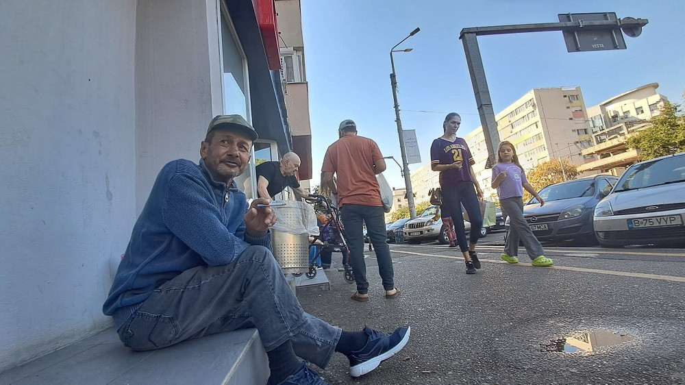 Nu mult mai departe de Ion Rădoi, îl găsesc pe Nicolae Banu, care e din Buzău, are 59 de ani și pare să trăiască din mila celor care ies de la Mega Image.