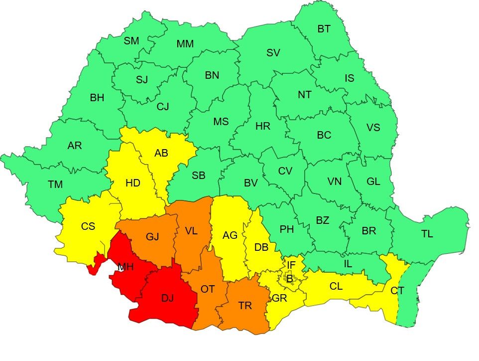 În aceste județe, unde minimele termice vor fi de 18-21 de grade, s-a instituit codul Portocaliu de căldură intensă în același interval, adică până pe 12 august la orele 10:00. Local, nopțile vor avea caracter tropical. Totodată, meteorollgii au prelungit și codul Galben de caniculă.