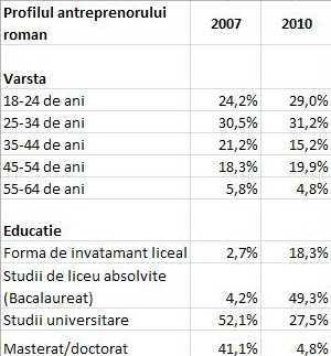 Daca in 2007, peste 90% dintre cei care isi deschideau o afacere urmasera o facultate sau aveau studii de masterat ori doctorat, in 2010 majoritatea antreprenorilor sunt cei cu studii de liceu.