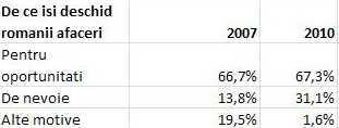 Pe de alta parte, se observa o foarte mare crestere a numarului celor care si-au infiintat o afacere din necesitate, acest procent crescand de la 13,8% in 2007 la 31,1% in urma cu doi ani.