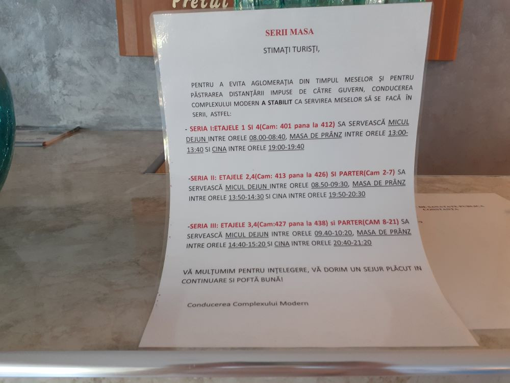 Cât despre servirea meselor, aceasta se face sub forma bufetului suedez adaptat. Turiștii arată ce vor să mânânce și li se pune în farfurie. În salonul cu pricina, unde se află expuse mâncărurile, turiștii sunt obligați să poarte mască de protecție, iar la intrare li se măsoară temperatura.