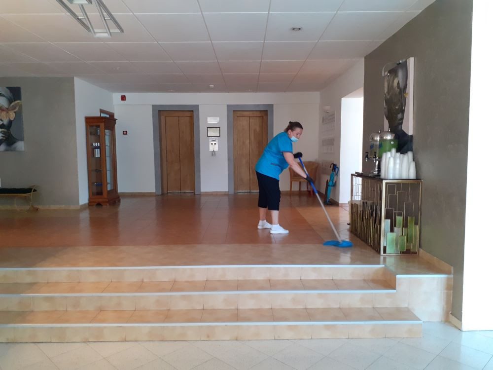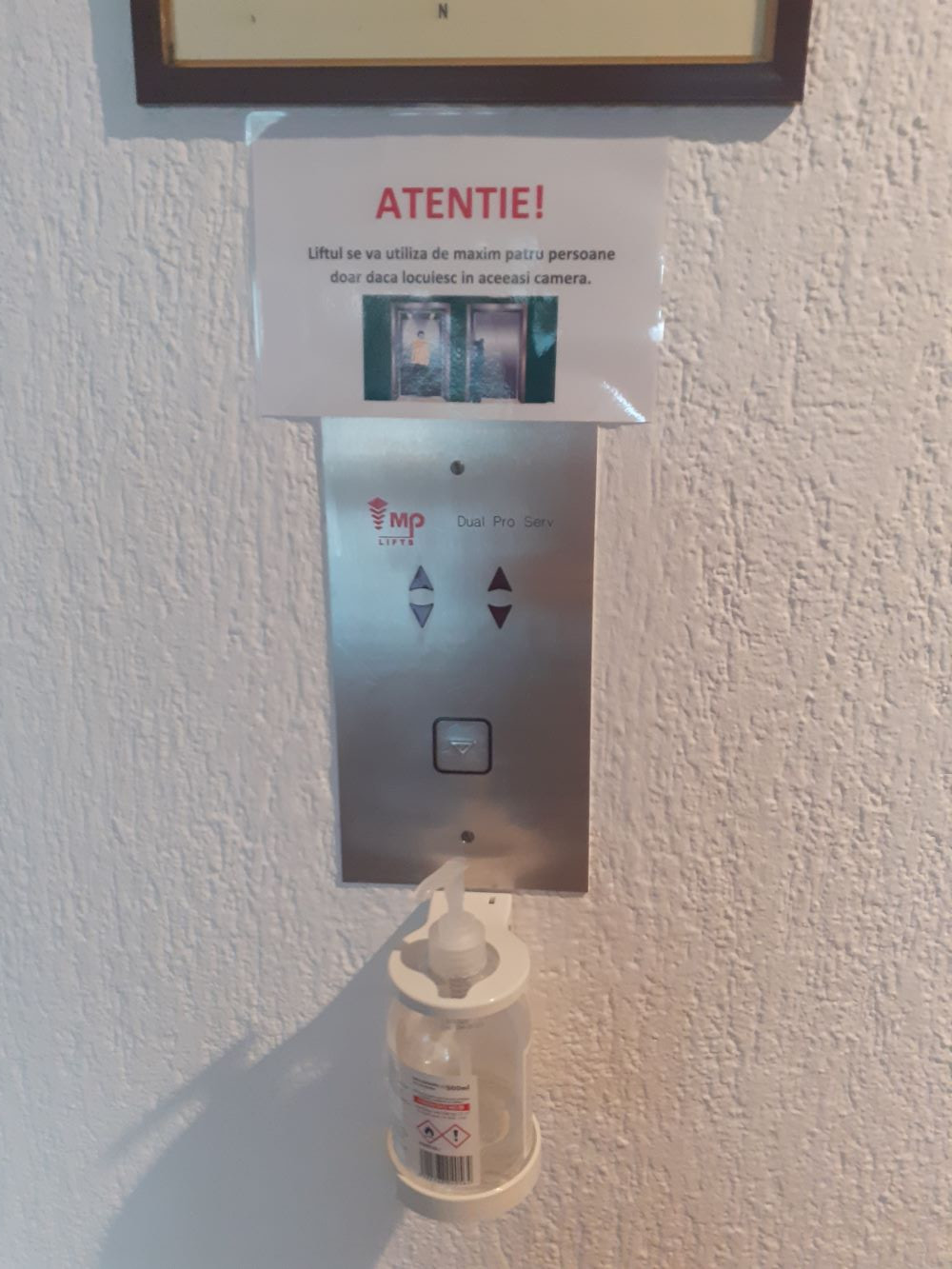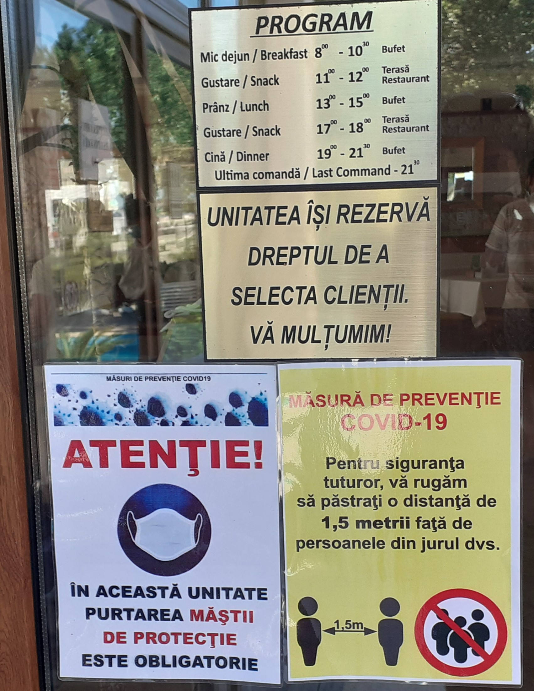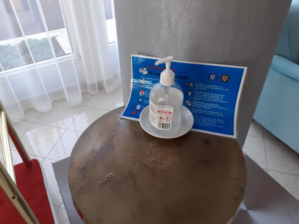 Încă de la intrarea în unitatea de cazare, ne întâmpină pe de o parte, un paznic, ce ne îndeamnă să purtăm masca de protecție, dar și un afiș care ne transmite același lucru. În plus, nu lipsește recipientul cu dezinfectant și, din nou, o notă de informare cu privire la noile modalități de protecție. De asemenea, la intrare există un covoraș îmbibat cu dezinfectant.