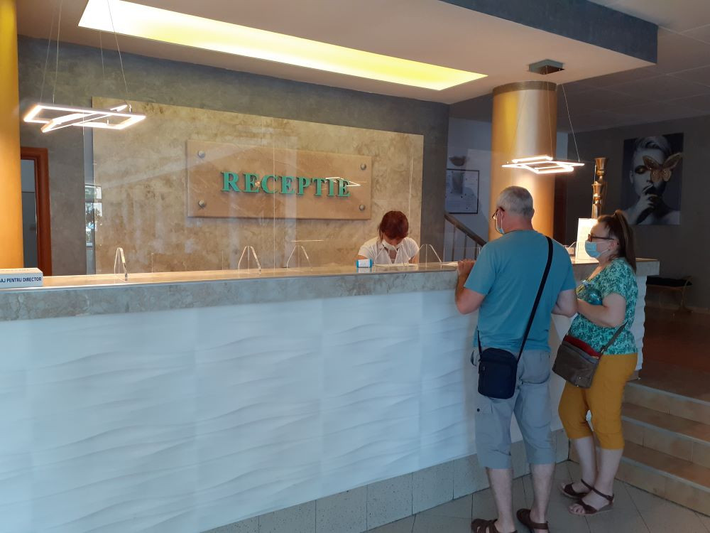 Pasul doi este dat de recepție, care este împrejmuită cu panouri de plexiglas. Recepționerele, ca de altfel, toți angajații hotelului (aici este vorba despre Hotel Modern, patru stele, Mamaia), poartă măști de protecție și chiar mănuși.