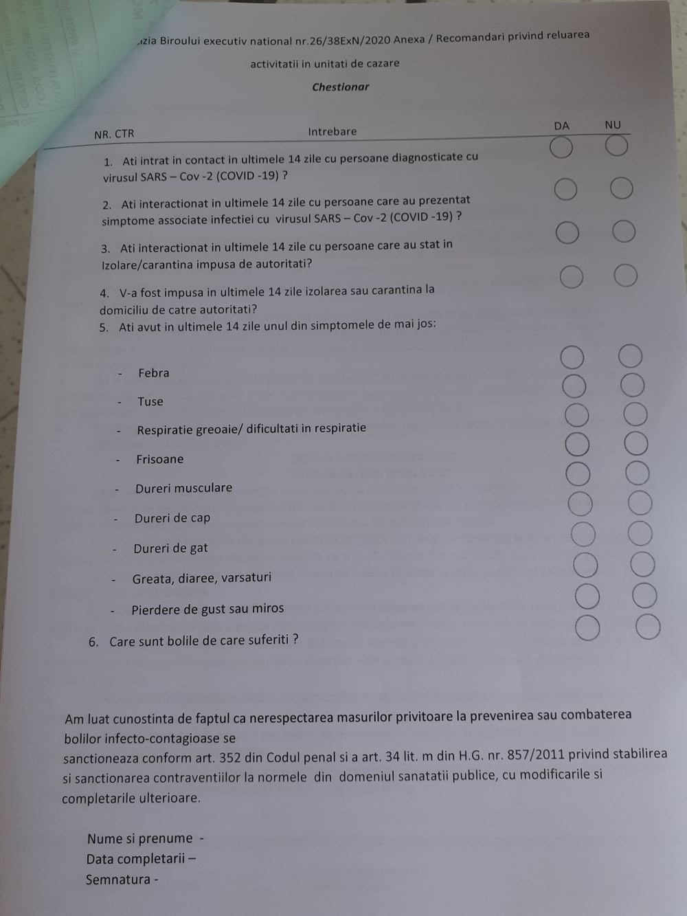 Check-in-ul presupune completarea unui formular, care reprezintă o formă mai simplă a unui triaj epidemiologic. În plus, la recepție nu mai este nevoie de predarea buletinului pentru înregistrare, deoarece chestionarul impune notarea lizibilă a datelor din buletin. Fiecărui turist i se oferă un pix, astfel încât să nu fie nevoie ca aceștia să atingă același obiect.