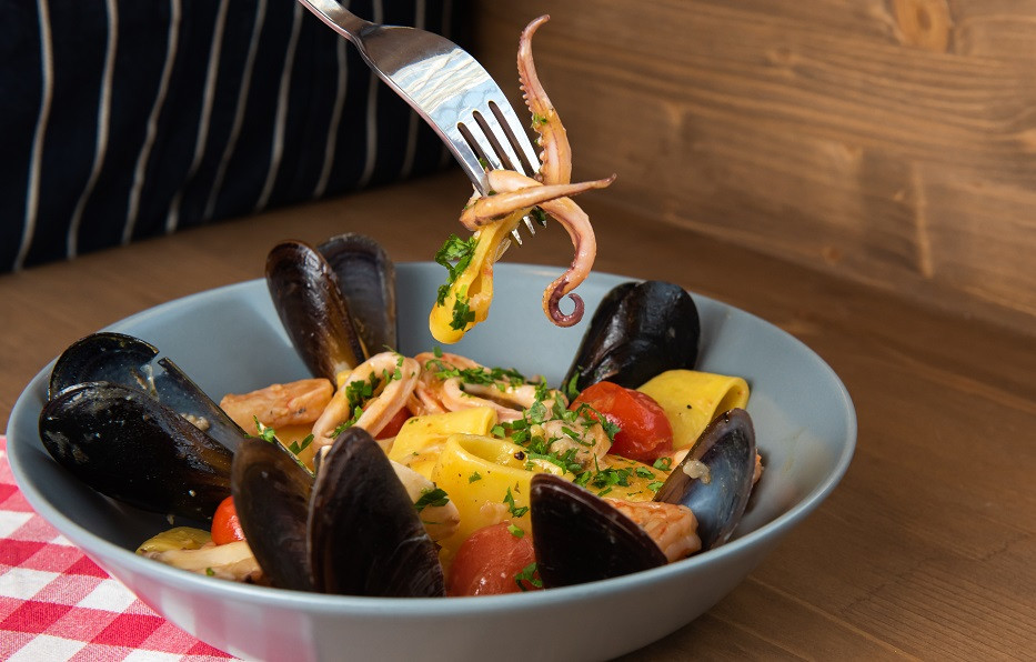 Dintre preparatele restaurantului din centrul vechi al Brașovului, Alex Năpar consideră că tagliatellele verzi cu spanac, cu creveți, dovlecei și roșii cherry este unul dintre cele mai atractive sortimente.