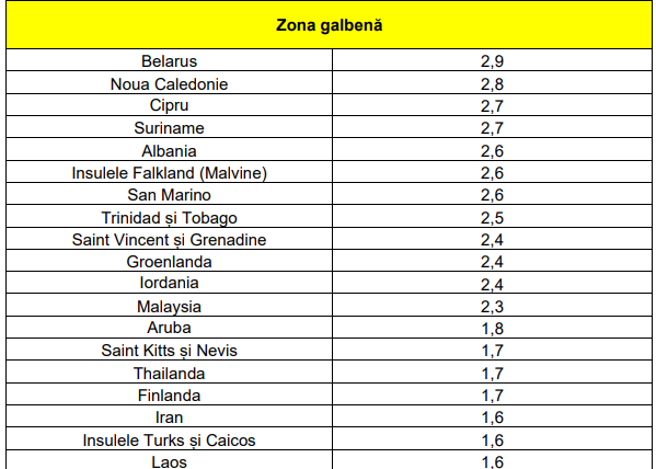 - în zona roșie au intrat: Germania, Elveția, Polonia, Norvegia, Statele Unite ale Americii, Liechtenstein, Andorra, Bosnia și Herțegovina, Macedonia de Nord, Azerbaidjan și Botswana;
