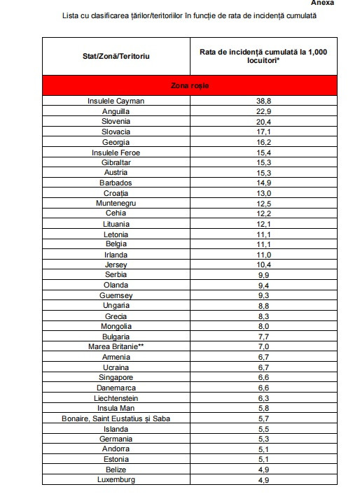 Comitetul Național pentru Situații de Urgență a aprobat în ședința de astăzi, 18 noiembrie 2021, Hotărârea numărul 104 privind actualizarea listei țărilor/teritoriilor de risc epidemiologic ridicat. În zona roșie au intrat: Cipru, Iordania, San Marino, Groenlanda și Trinidad și Tobago.