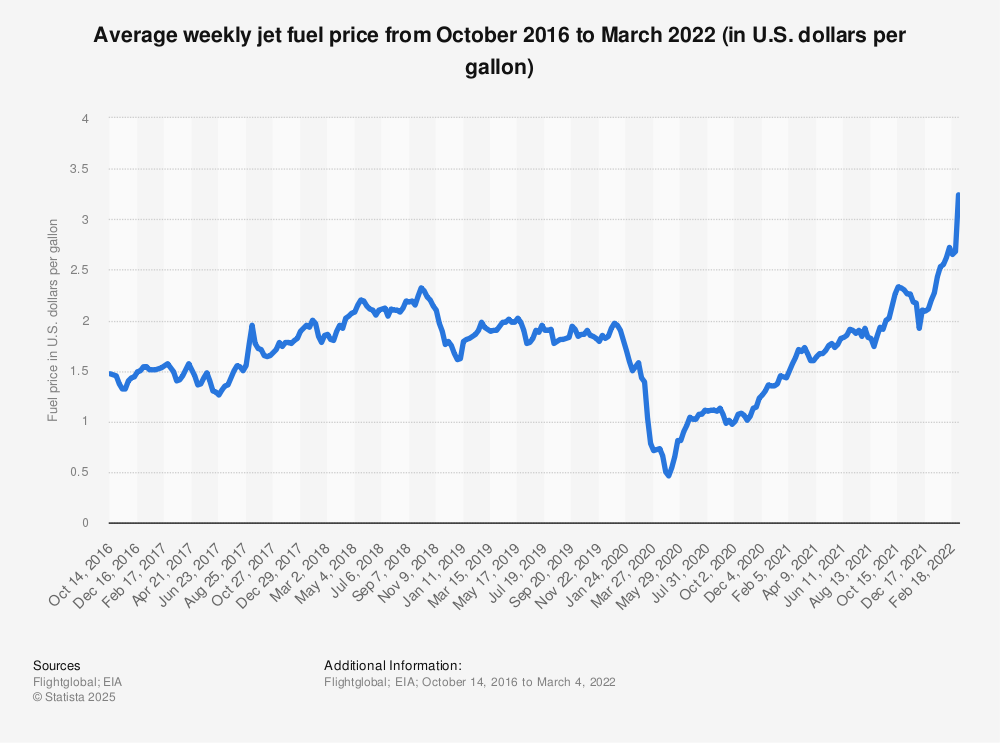 Creșterea treptată a prețului petrolului începând din a doua jumătate a anului 2021 și accelerarea ritmului de creștere în urma războiului din Ucraina au majorat semnificativ costurile operaționale ale companiilor aeriene.