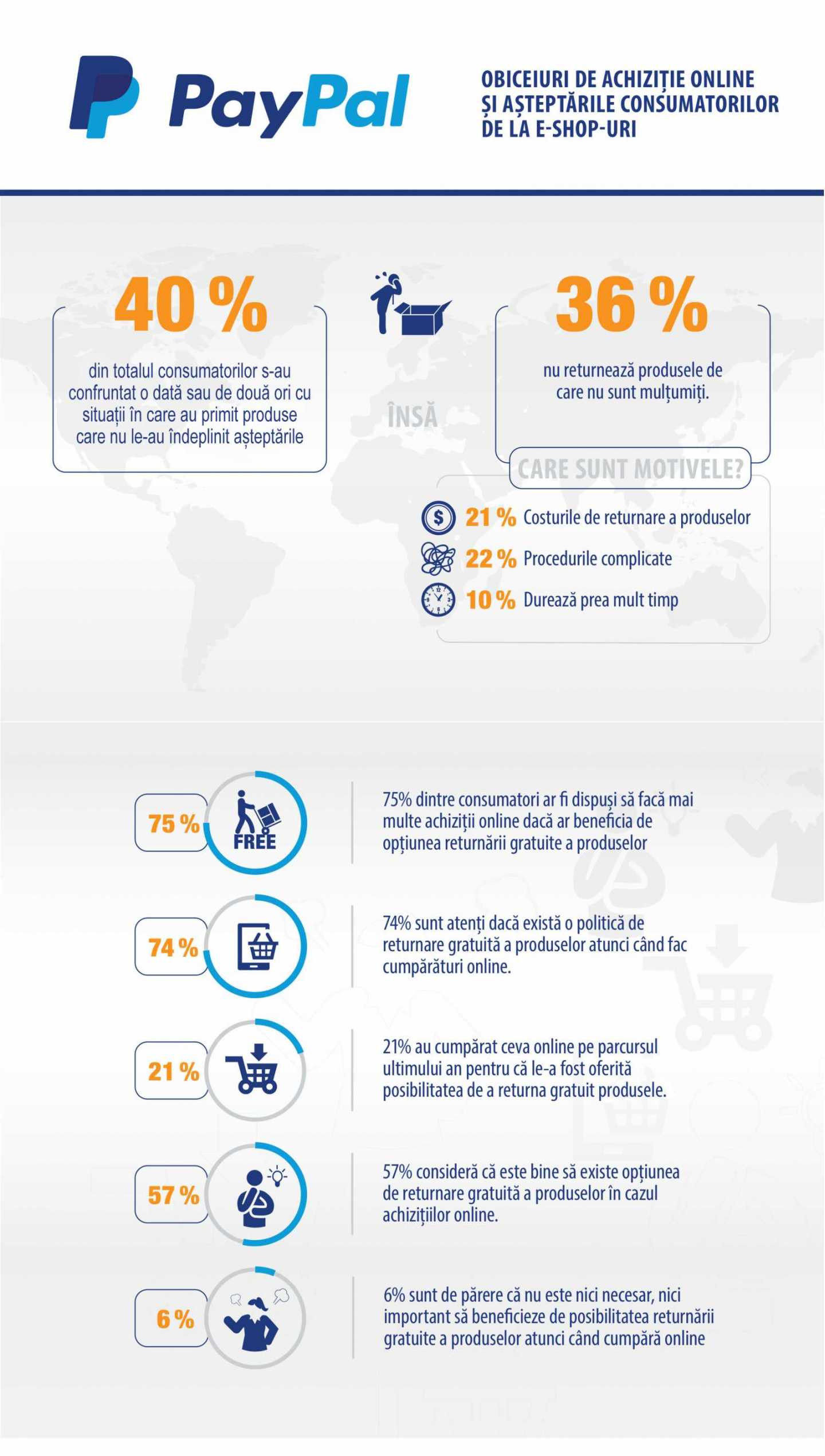 - consumatorii nu numai ca au adoptat acest mod de a face cumparaturi, insa stiu cum sa obtina maximul de beneficii de pe urma lui. De aceea, nu trebuie sa reprezinte o surpriza faptul ca persoanele care fac achizitii online se asteapta la standarde care sa opereze global. Potrivit studiului, comertul electronic are un potential extraordinar de crestere din moment ce consumatorii ar fi dispusi sa cumpere online mult mai mult daca nu ar fi preocupati nu de achizitia online a produsului in sine, ci de posibilitatea de a-l returna sau nu. De aceea, modificarea acestei abordari si sporirea increderii consumatorilor in ceea ce priveste achizitiile online se afla la baza protectiei pentru consumatori oferita de PayPal, extinsa acum prin intermediul PayPal Refunded Returns.