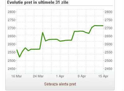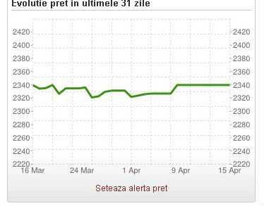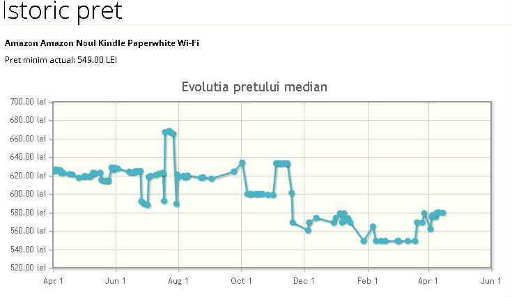 Pe Price.ro putem urmari si alte evolutii de preturi. Astfel, pentru Kindle Paperwhite, varianta din 2014, putem vedea pe grafic ca, in cazul a zece magazine, preturile au scazut constant pana la jumatate lunii martie, crescand din aprilie. Pretul mediu era in data de 19 martie de 541 de lei, apoi a crescut brusc la peste 581 de lei in 14 aprilie, o crestere de circa 7%.