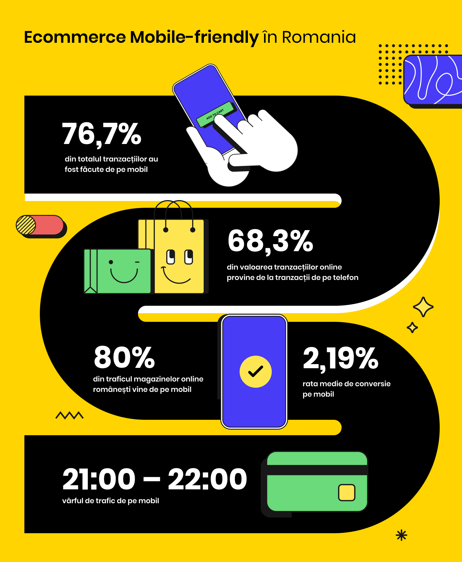 De asemenea, traficul magazinelor online românești este generat în proporție de peste 80% de către dispozitivele mobile, în creștere de la 75,5% în 2021. În cazul magazinelor online consacrate consultate de GPeC, traficul generat de telefoanele mobile depășește 85%.