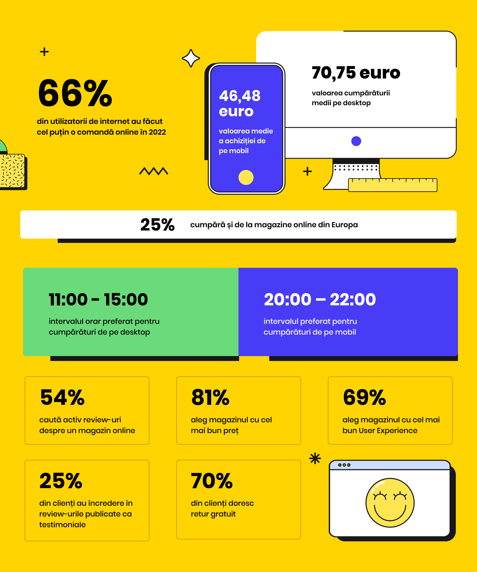 Potrivit statisticilor 2Performant, în medie*, în 2022 românii au cheltuit 70,75 euro pentru cumpărăturile efectuate de pe desktop, comparativ cu 66,67 euro în 2021.