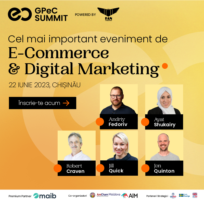 Pe 22 iunie are loc prima ediție GPeC în Chișinău, Republica Moldova – cel mai important eveniment de E-Commerce și Digital Marketing din regiune – cu o tradiție de 18 ani în piață. Evenimentul reunește 5 speakeri internaționali de top din SUA, Marea Britanie și Ucraina precum și 16 specialiști din România și Republica Moldova. Înscrierile se pot face online pe site-ul GPeC.ro, iar până pe 16 iunie este valabilă Oferta Last Minute care aduce reduceri din prețul biletelor, acestea pornind de la doar 89 EUR / persoană: https://www.gpec.ro/gpec-republica-moldova/