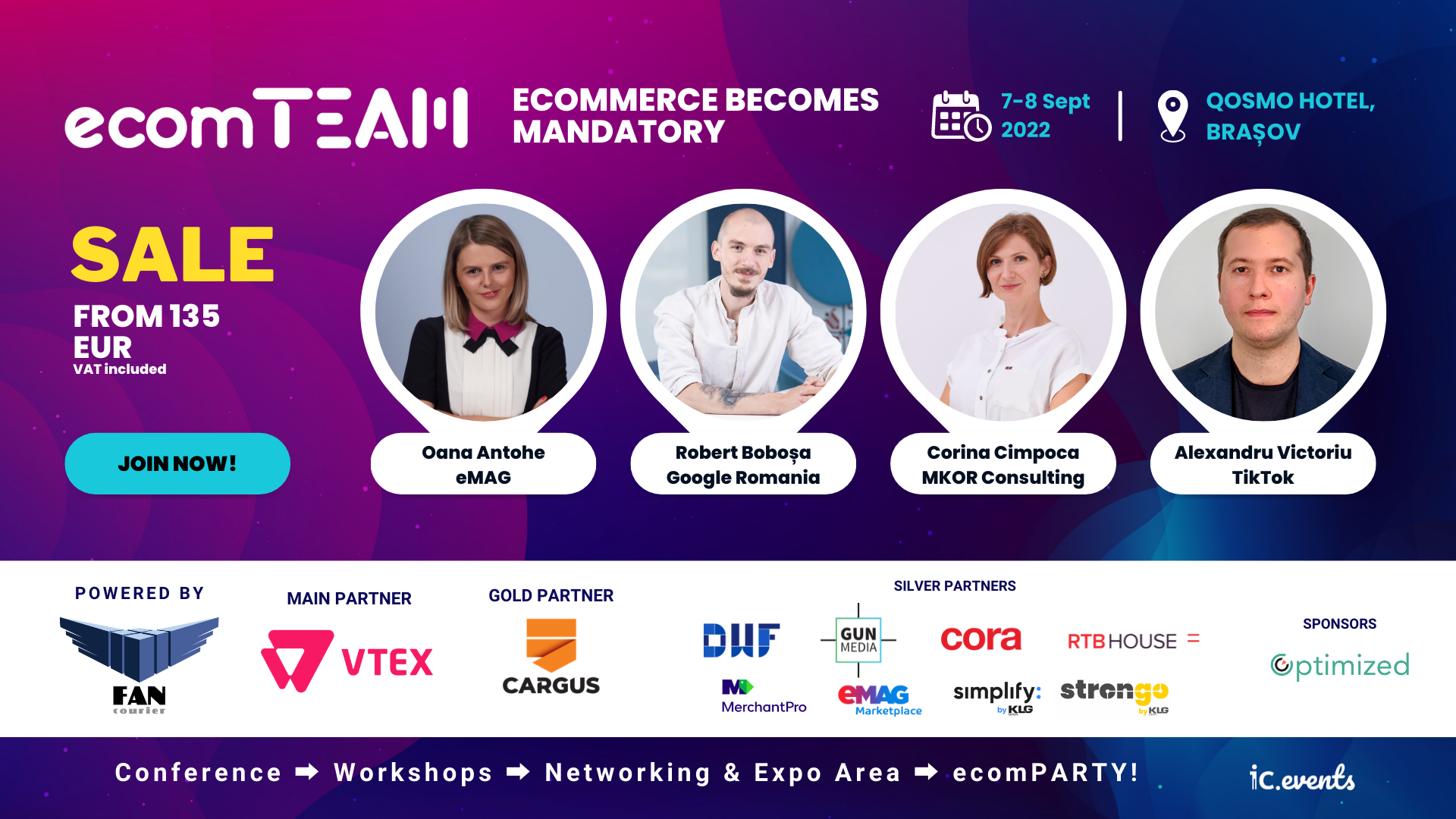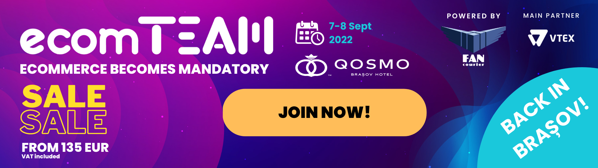 Abordări mai exhaustive ale temelor de mai sus, dar și a altor aspecte din industrie precum implementarea corectă a Google Analytics 4, optimizare SEO, PPC sau dezvoltarea magazinului online prin intermediul marketplace-urilor, v-am pregătit în cadrul workshop-urilor ecomTEAM, susținute de specialiști de la Google, DWF, Optimized, MKOR sau eMAG. În prima zi a evenimentului vor fi organizate 2 workshop-uri, în timp ce în cea de-a doua zi vom avea 4 workshop-uri. Rămâi cu ochii pe pagina evenimentului AICI pentru a fi la curent cu toate noutățile legate de ecomTEAM 2022.