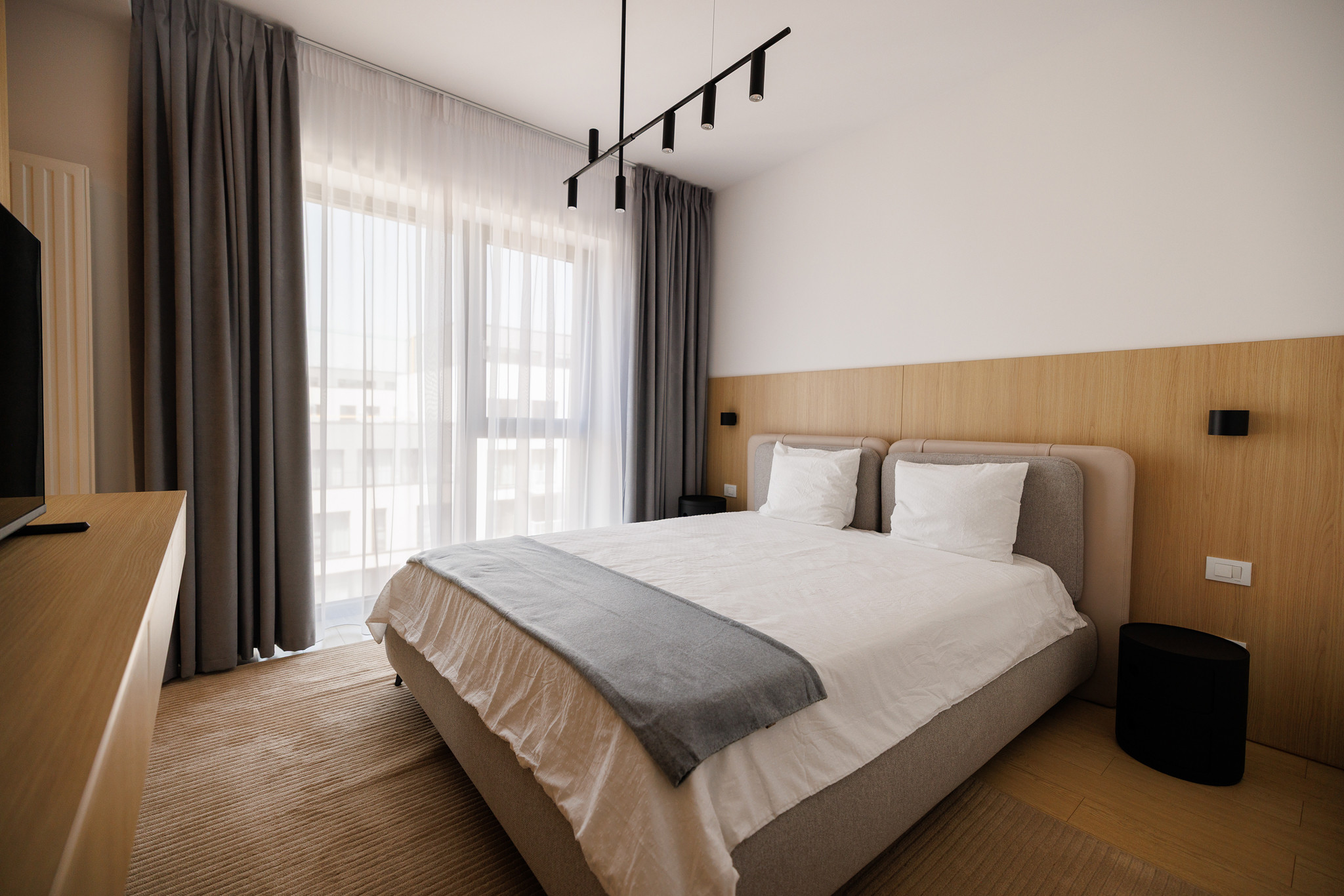 Pe cealaltă parte a apartamentului se află celălalt dormitor, care se prelungește, în forma unui L cu un dressing destul de mare. Suprafața dormitorului este de aproape 14 mp, dar la aceștia se adaugă alți 4,6 mp de dressing.