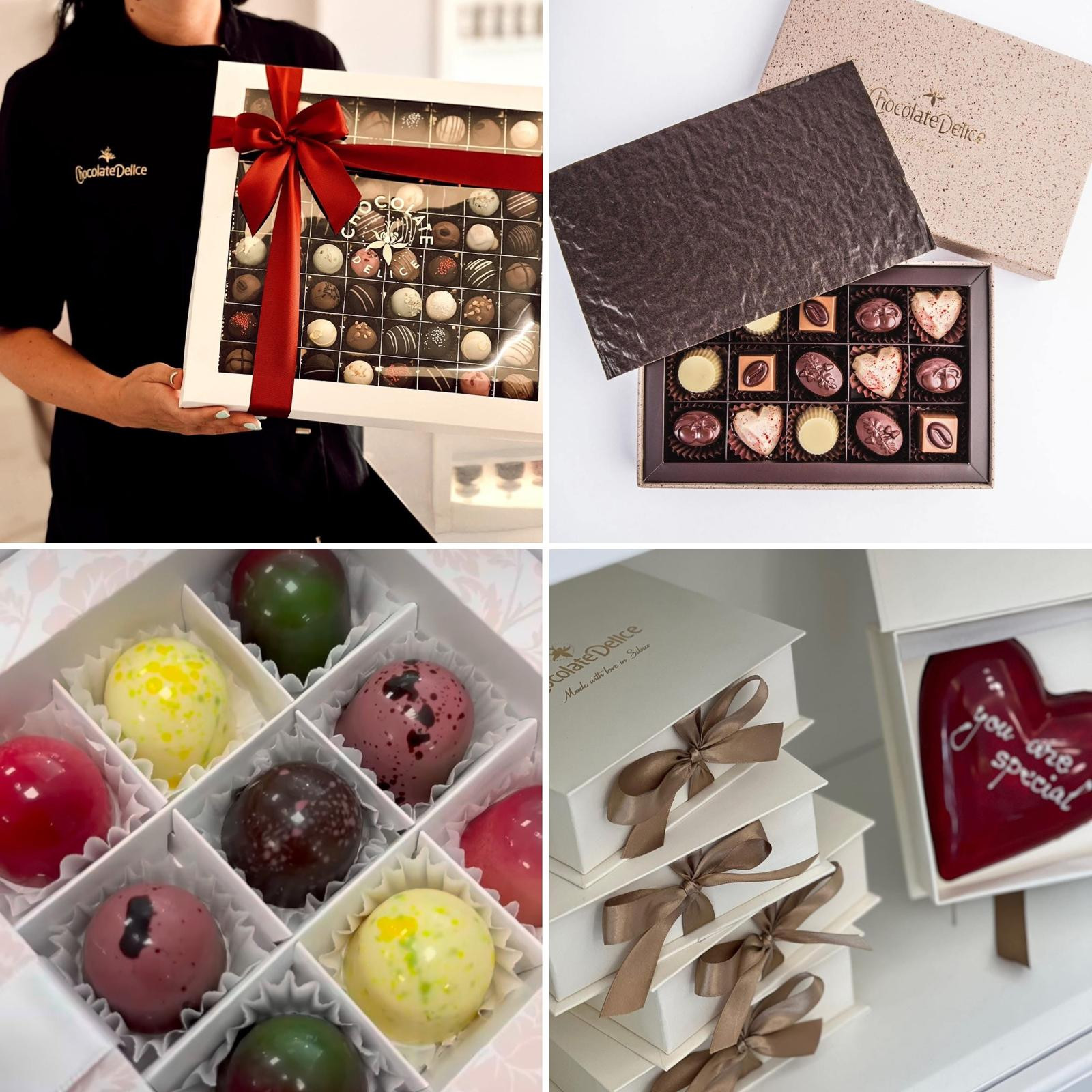- Sortimente bean-to-bar și praline umplute cu creme naturale