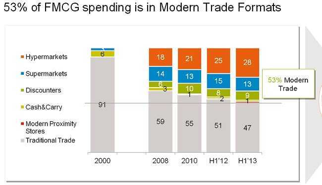 Avand in vedere o crestere de circa 3 procente in fiecare an a comertului modern, ponderea acestuia ar putea ajunge la 55-60% in 2015.