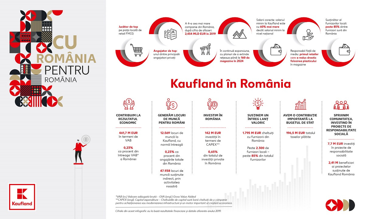 Anul trecut, Kaufland a generat valoarea adăugată directă în România de aproximativ 461,7 milioane de euro, a oferit 12.500 de locuri de muncă cu normă întreagă și a susținut aproape 48.000 de locuri de muncă în economia românească prin activitatea, investițiile și salariile oferite. Impactul e cu atât mai puternic cu cât Kaufland România creează parteneriate și pe termen lung cu producători locali: 85% din produsele de la raft sunt provenite de la furnizori români, iar din fiecare leu cheltuit la casă, 66% merg direct către afaceri românești.