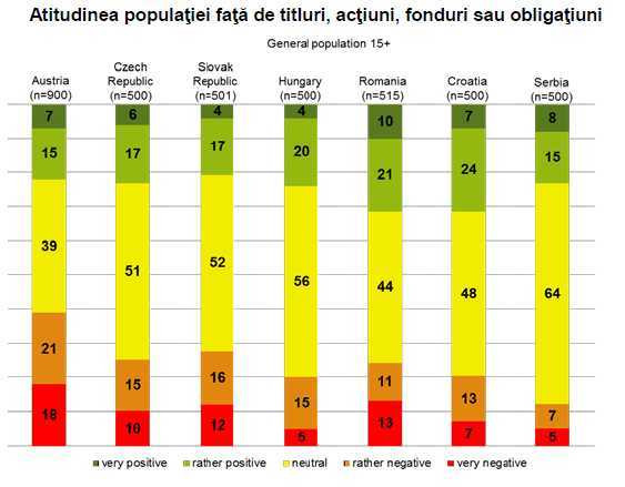 In aceeasi zi in care BNR a vorbit despre continuarea proiectului de educatie financiara, bancherii de la Erste Group au dat publicitatii un raport din care rezulta ca romanii au cea mai pozitiva atitudine fata de actiuni, fonduri si obligatiuni, dintre locuitorii din Europa Centrala si de Est (ECE). Astfel, 21% dintre participantii romani la sondaj au spus ca au o atitudine mai degraba pozitiva fata de actiuni, fonduri sau obligatiuni. Alti 10% au spus ca au o atitudine foarte pozitiva fata de aceleasi instrumente financiare, ducand totalul raspunsurilor favorabile la 31%, la egalitate cu Croatia si totodata cel mai mare procent din ECE (vezi tabelul atasat).